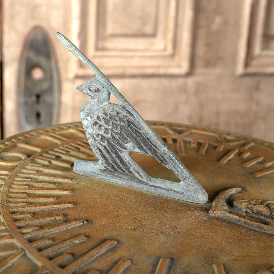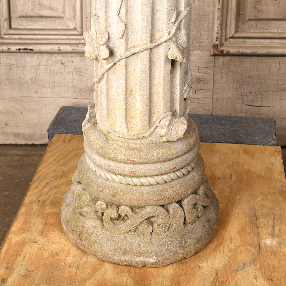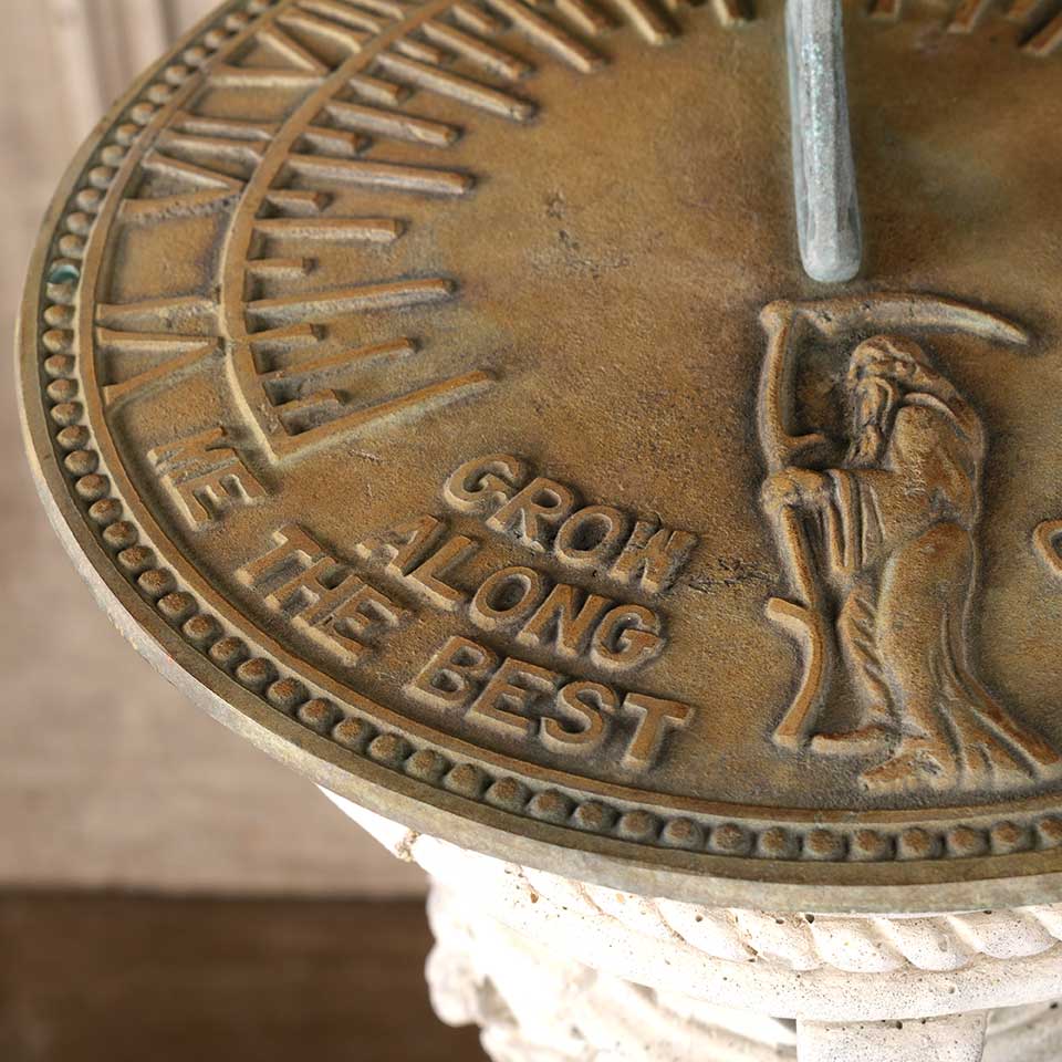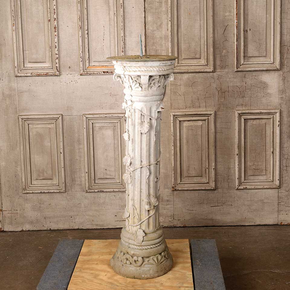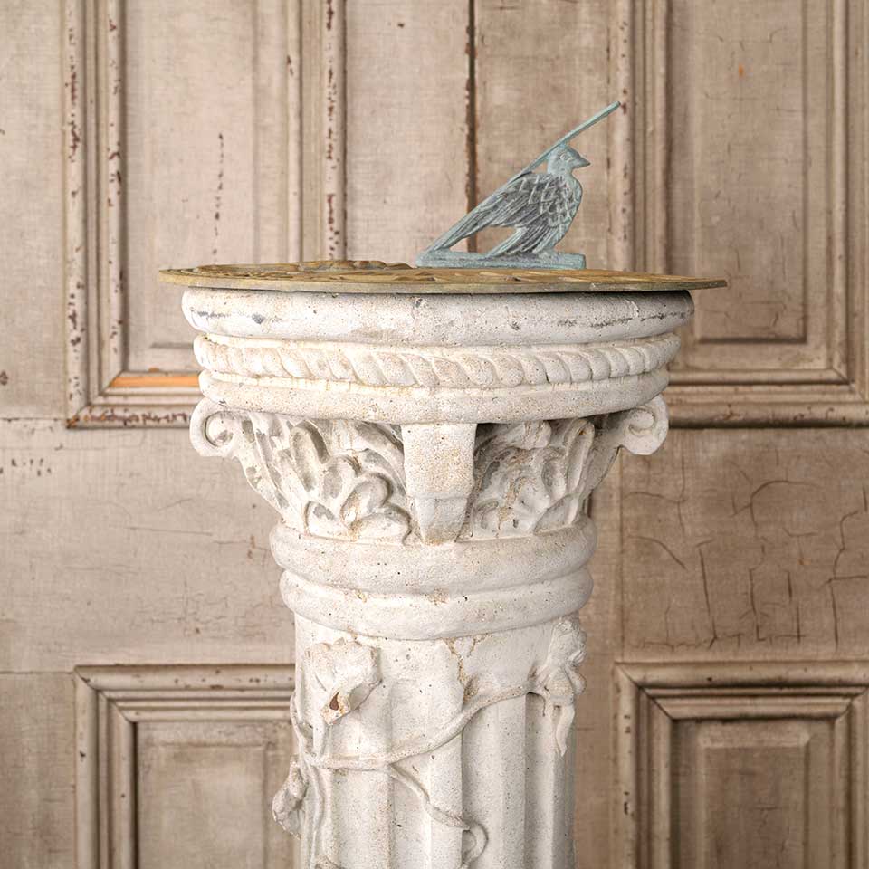 Architectural salvage two piece brass garden sundial and ornate concrete pedestal base. The sundial measures approx. 11" in diameter x 3 1/2" tall and the pedestal 35" tall with a 9 3/4" diameter top and a 10" diameter base. See photos to evaluate condition. Priced at $525 for the two piece set.