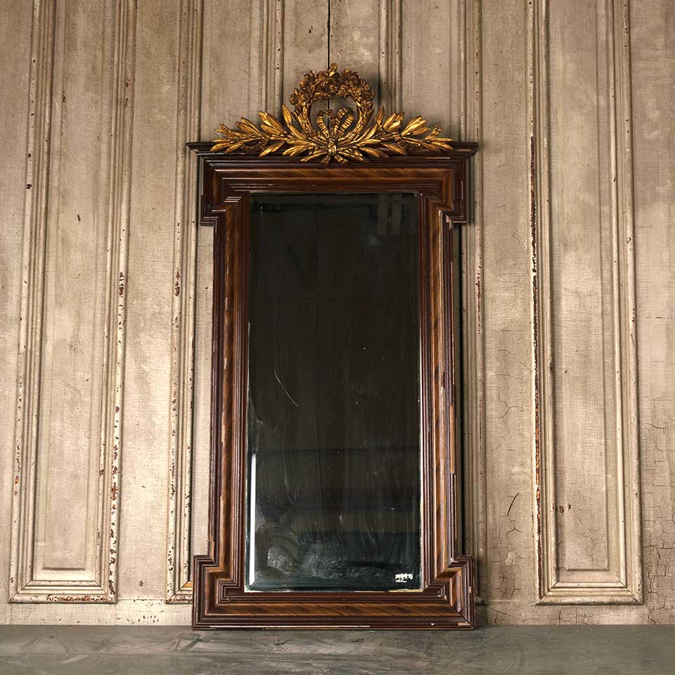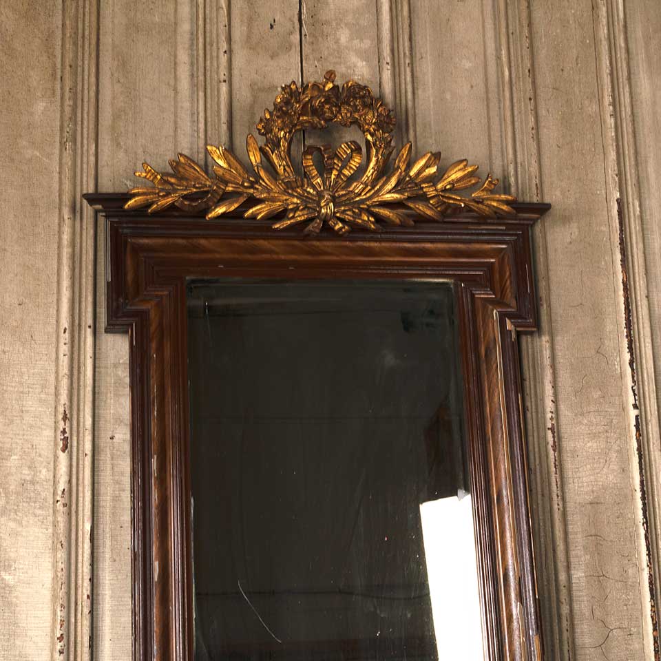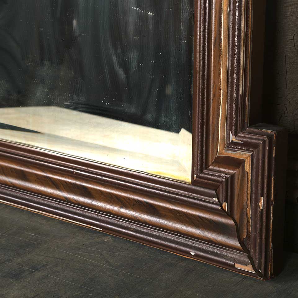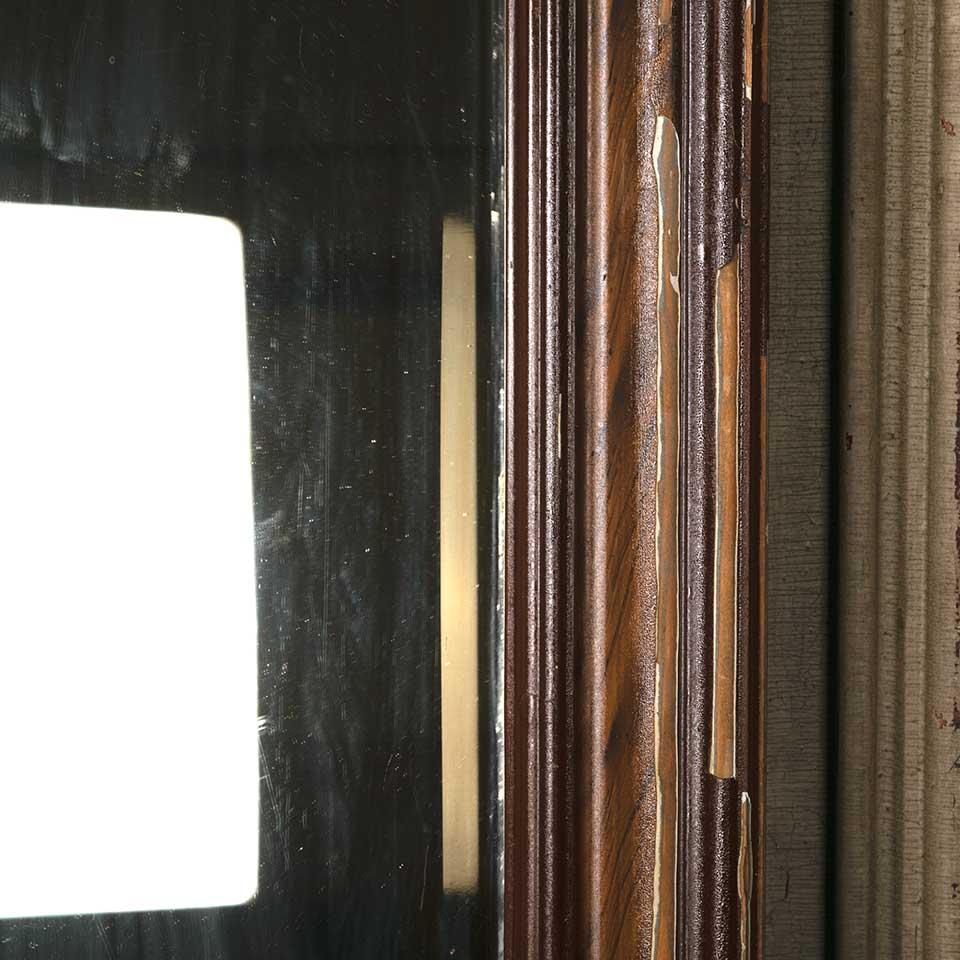 Architectural salvage antique beveled glass mirror with ornate pediment measuring approx. 27" wide x 51" tall x 5" front to back. There's some material loss on the edges and the top left return trim piece is missing. See photos to evaluate condition.