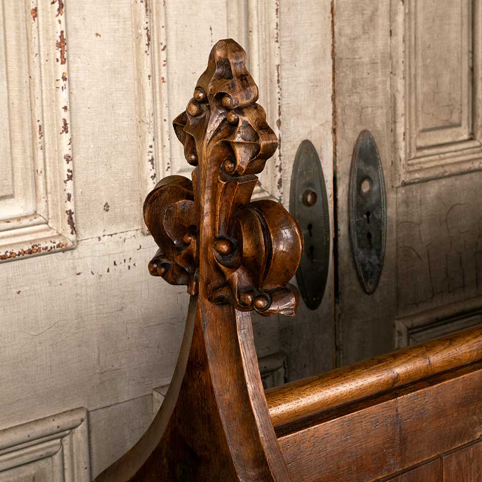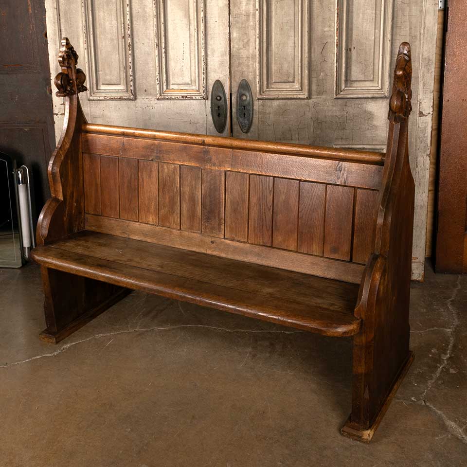 Architectural salvage antique carved wood church pew bench measuring approx. 56 7/8" wide x 48" tall x 25" front to back. Carved finials are different. See photos to evaluate condition.