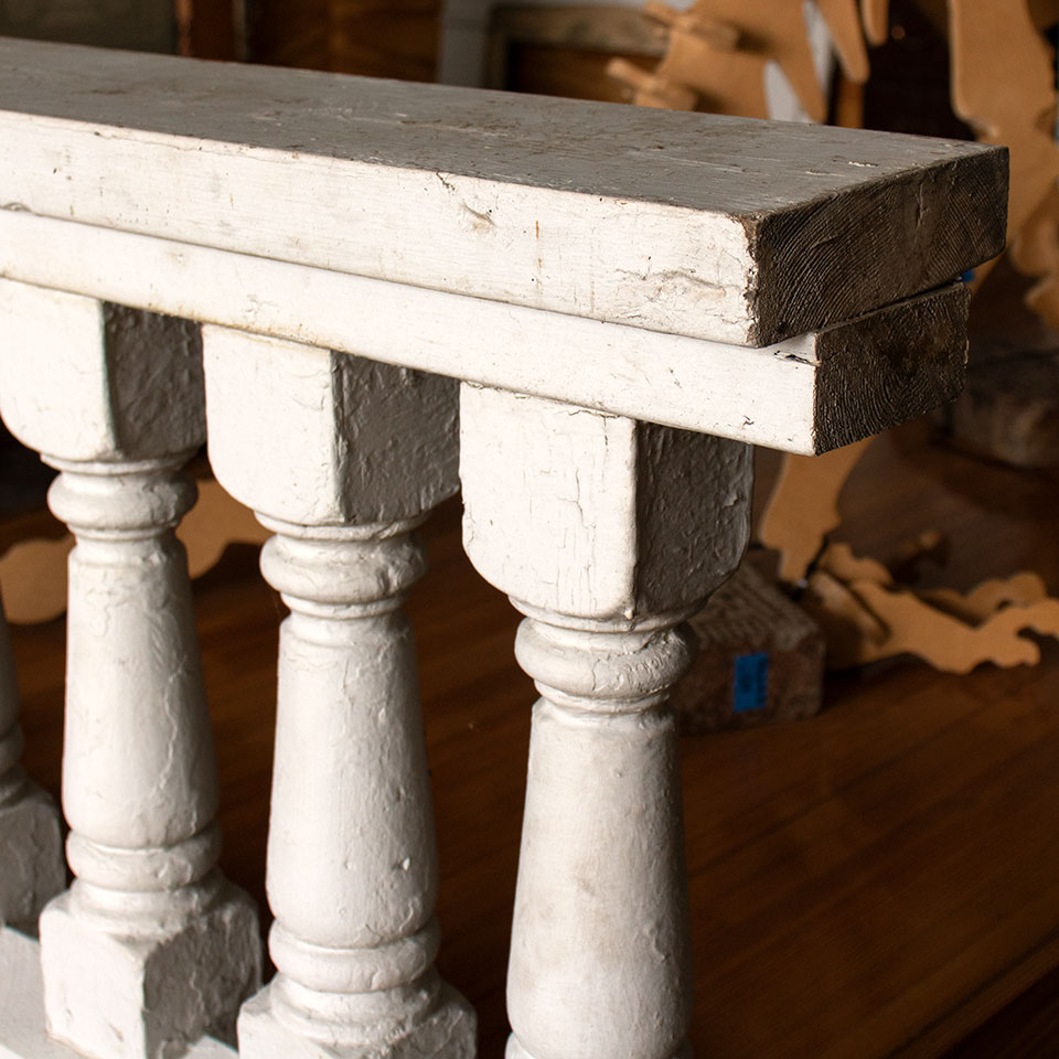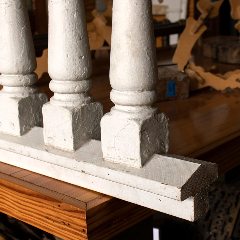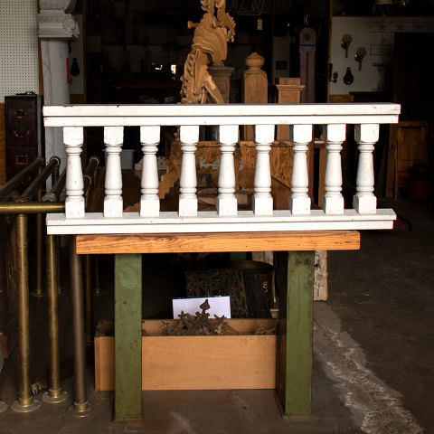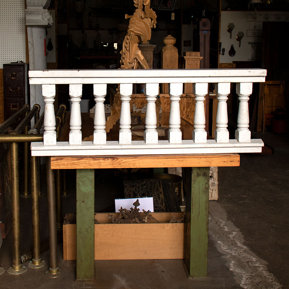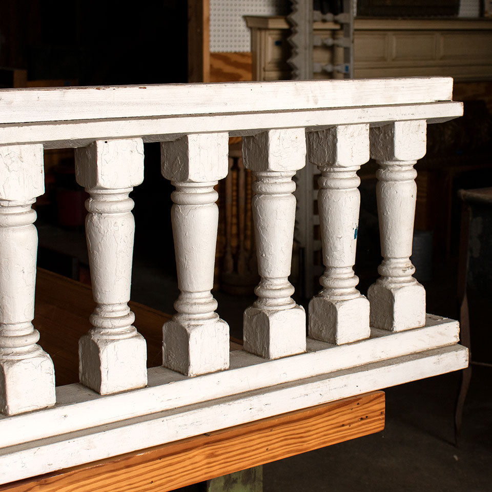 Vintage/antique architectural salvage wood balcony railing measuring approximately 53 7/8" wide x 19 3/4" tall x 5 1/2" thick. Due to the nature of architectural salvage - condition and color may vary.