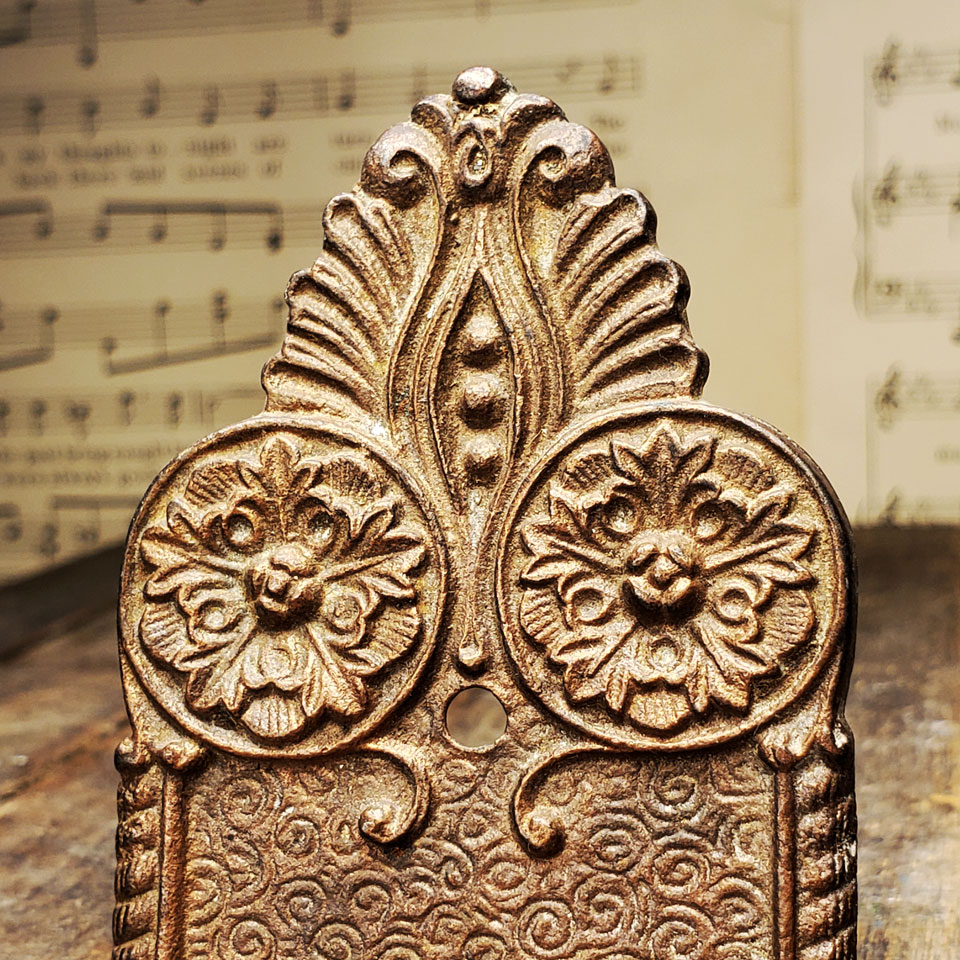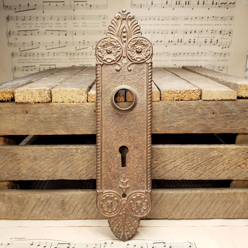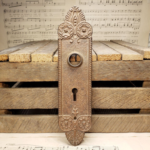 Antique architectural salvage cast bronze with ornate pattern door backplate hardware measuring approximately 2 1/8" wide x 8 1/2" tall with a 7/8" collar. Distance from collar to keyhole is 2 1/4" on center.