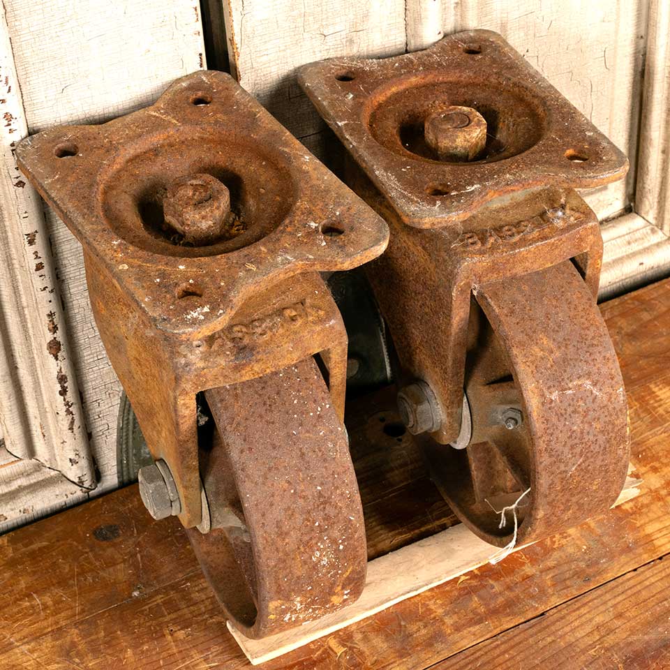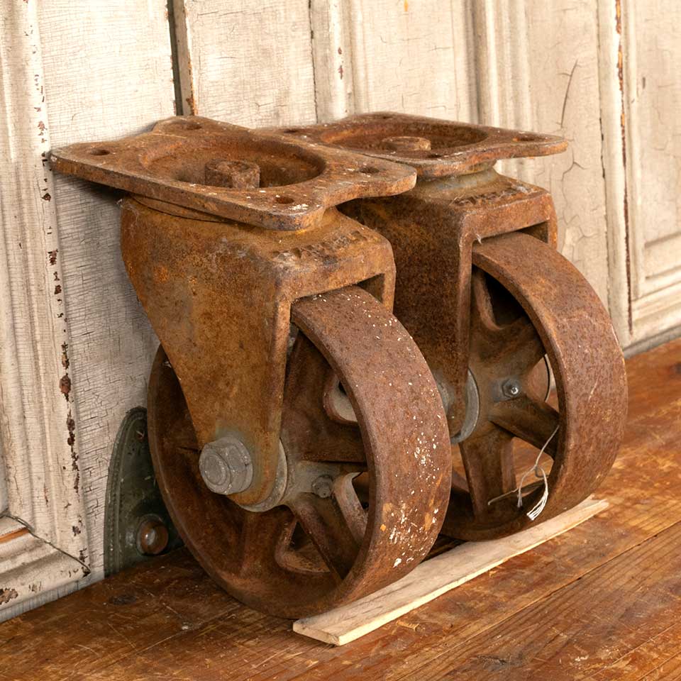 Pair of salvaged antique cast iron industrial factory cart caster wheels each measuring approx. 5 7/16" wide x 10 1/8" tall x 10 1/4" thick. See photos to evaluate condition. Priced at $178 for the pair.