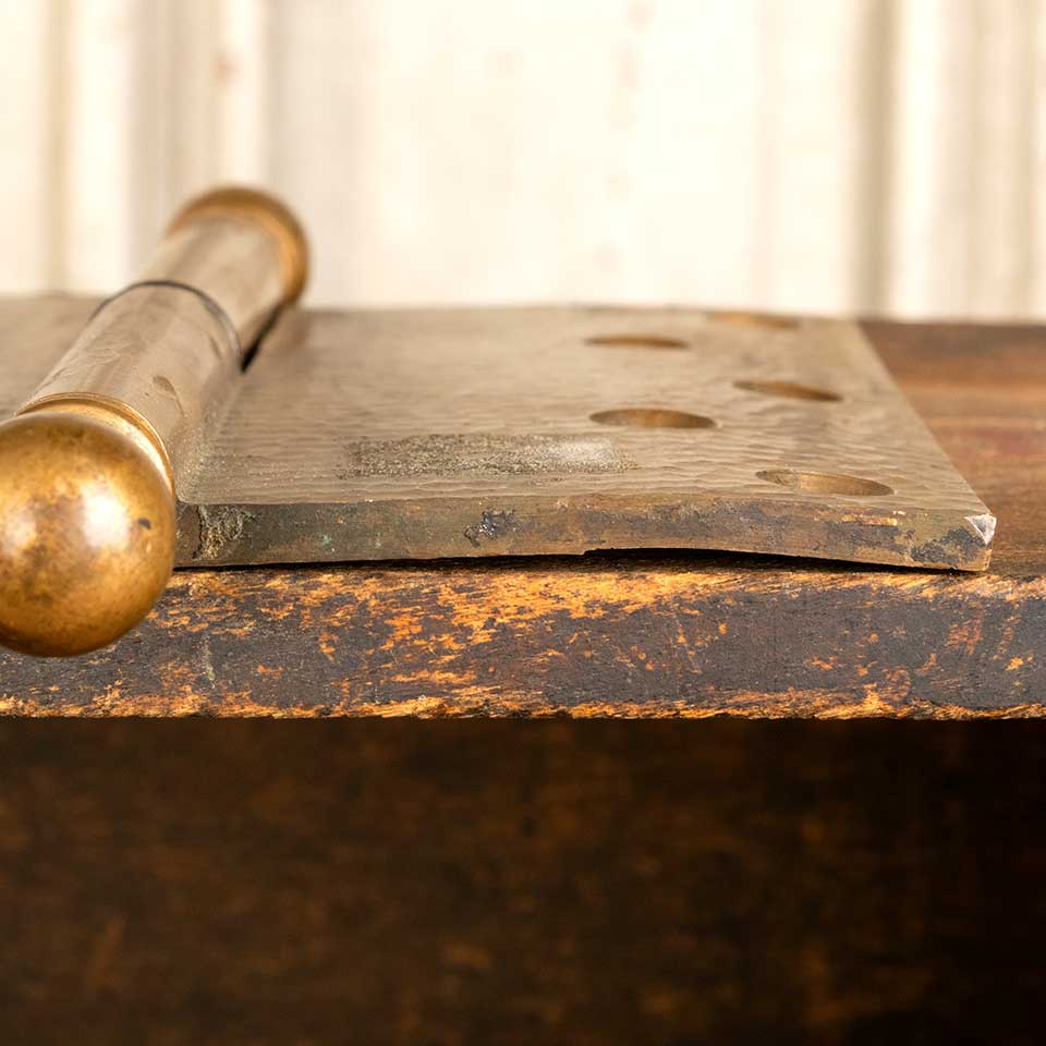 Antique architectural salvage large hammered solid brass ball finial lift off door hinge hardware (right hand swing) each measuring approx. 6 1/8" wide x 5 7/8" tall (7 3/4 tall including finials). Color and condition vary, see photos to evaluate. Priced at $95/each.