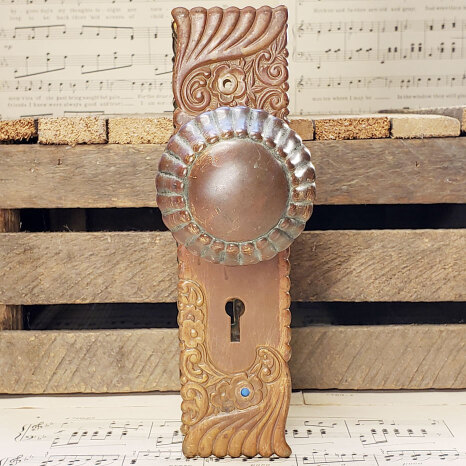 Architectural salvage antique bronze Russell & Erwin interior door hardware set circa 1894 including a pair of 2 1/4" diameter knobs with tapped spindle and set screws and two plates each measuring 1 7/8" x 7 1/4". Color and condition vary, see photos to evaluate. Priced at $175/ set.