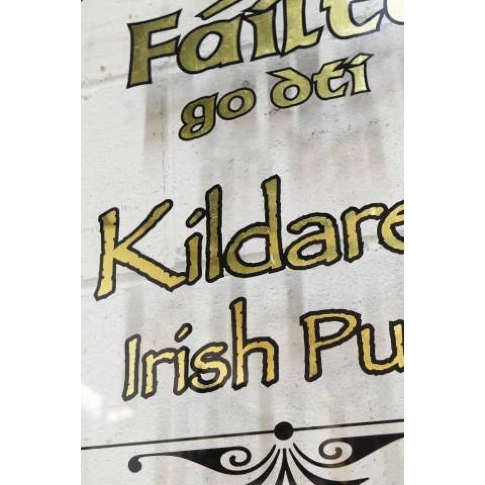 Architectural salvage glass window pane from Kildare's Irish Pub with gold lettering measuring approximately 26 3/4" wide x 47 3/4" tall. Lettering translates to "Welcome to Kildare's Irish Pub".