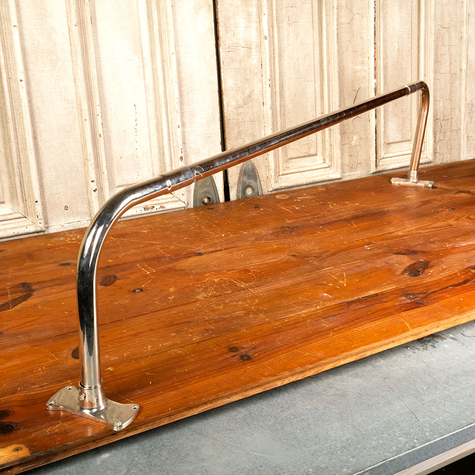 Architectural salvage chrome shower curtain / drapery rod measuring approx. 1" in diameter x 50 1/4" long x 12" front to back and brackets each measuring approx. 2" x 4 1/2". Each turned end can be adjusted or removed from the main bar. See photos to evaluate condition.