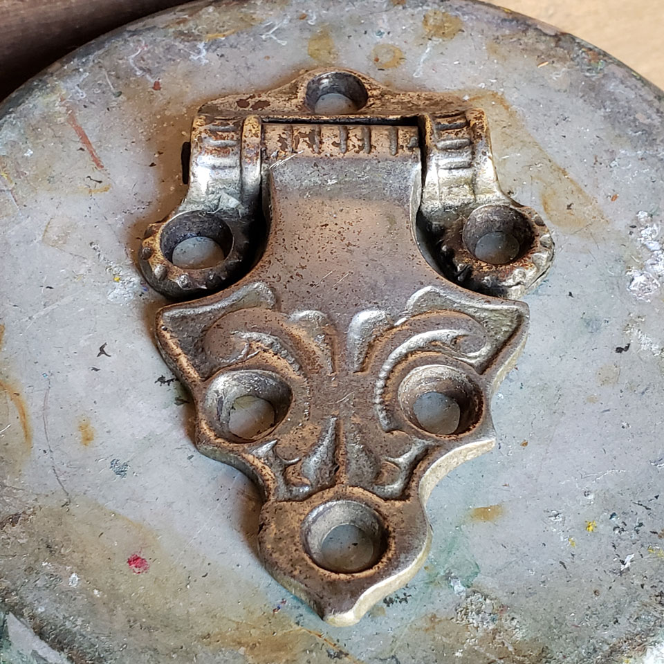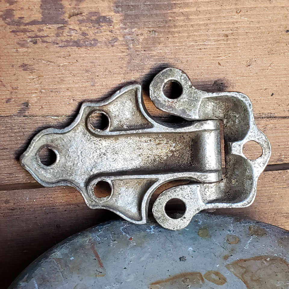 Antique architectural salvage nickel plated brass wood ice box cabinet door hinge hardware measuring approximately 2" x 3 1/8".