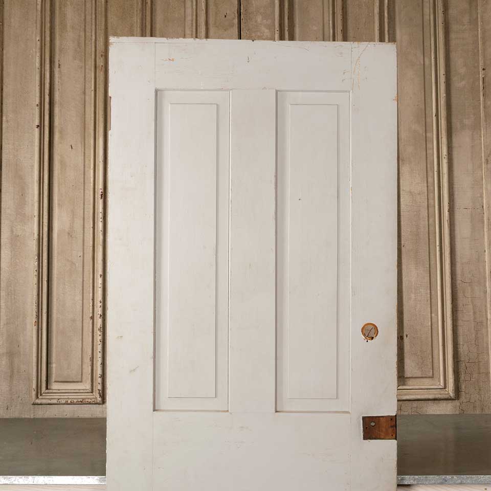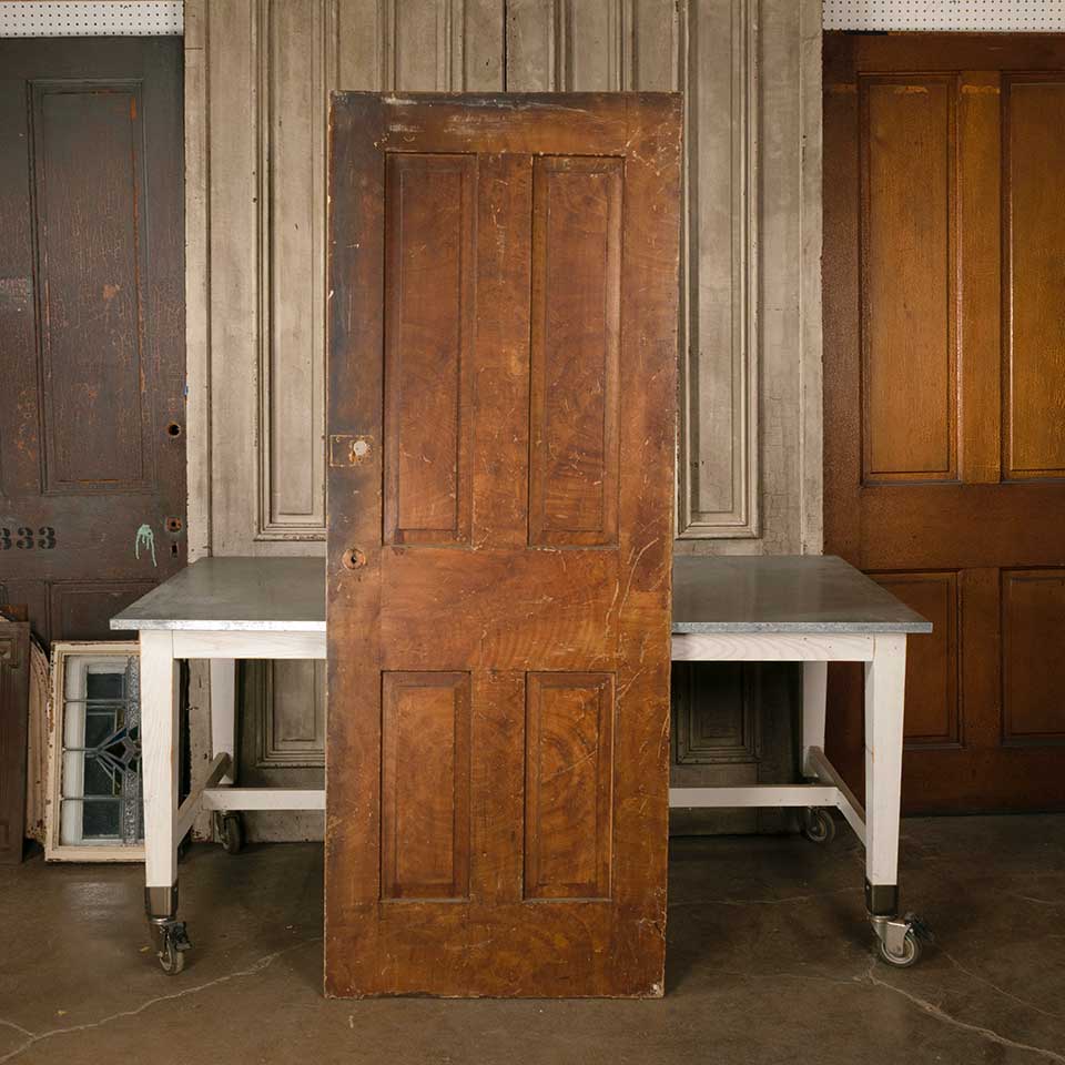 Architectural salvage antique four panel grain painted interior wood door measuring approx. 30" wide x 78 1/2" tall x 1 3/8" thick. There's a piece wood missing from one side of the door. See photos to evaluate condition.