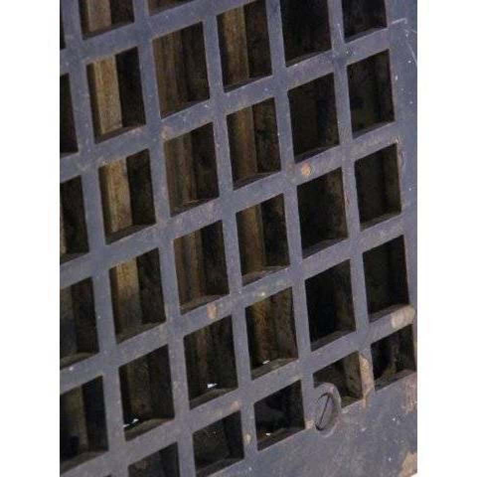 Vintage/antique architectural salvage cast iron heat grate with operable louvers measuring approximately 12" wide x 14" tall (insert dimensions) and 14" wide x 15 15/16" tall (outside dimensions).