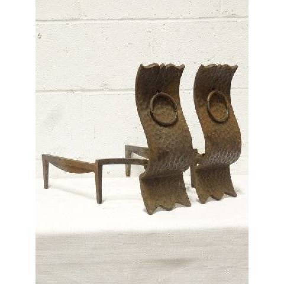 Pair of vintage/antique architectural salvage wrought iron Arts & Crafts fireplace andirons with hammered finish each measuring approximately 5 1/2" wide x 12" tall x 17 3/4" front to back. Priced at $195 for the pair.