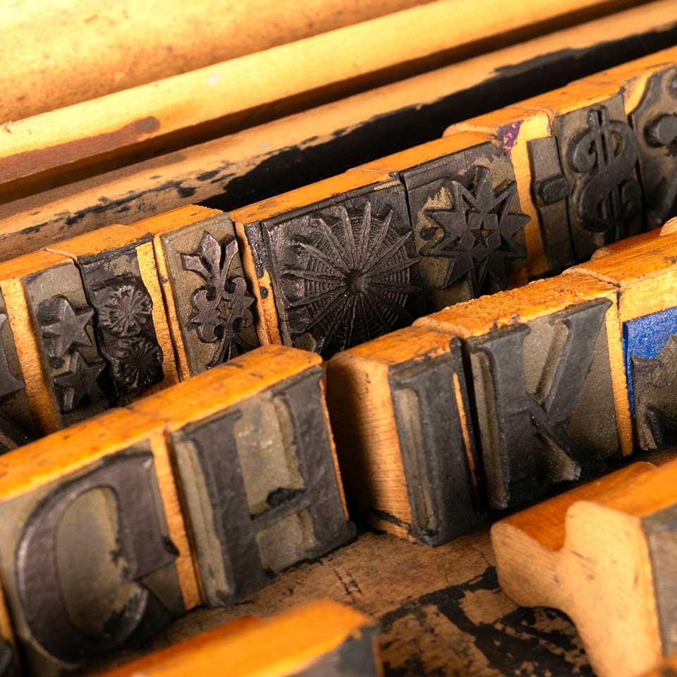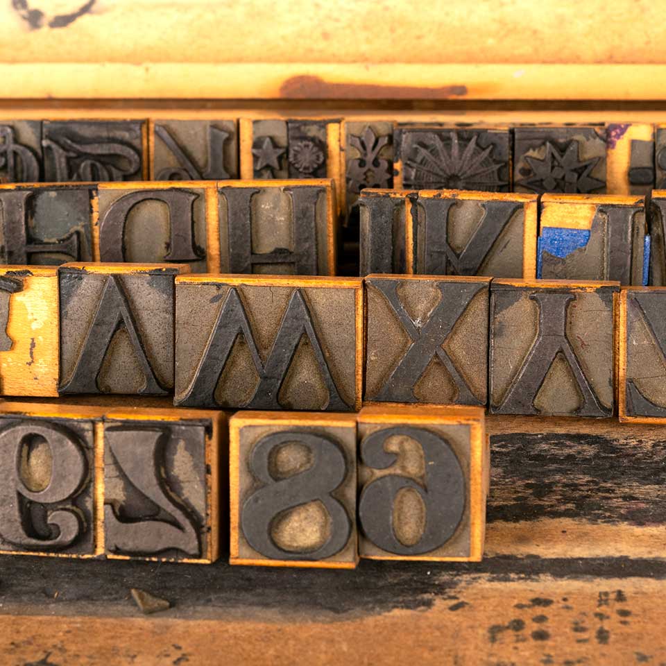 Antique Columbia Sign and Show Card Printer stamp set with approximately 74 pieces including numbers 0-9, letters A-Z, and extras. The wood case measures approx. 20 3/4" wide x 1 3/4" tall x 10 1/2" front to back and is marked C.H. Morse & Son, Rochester, N.Y. Priced at $189 for the set.