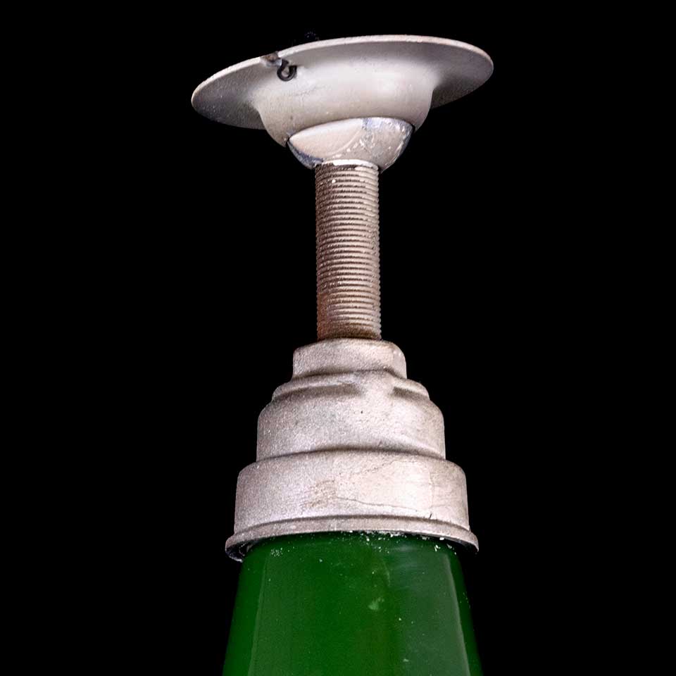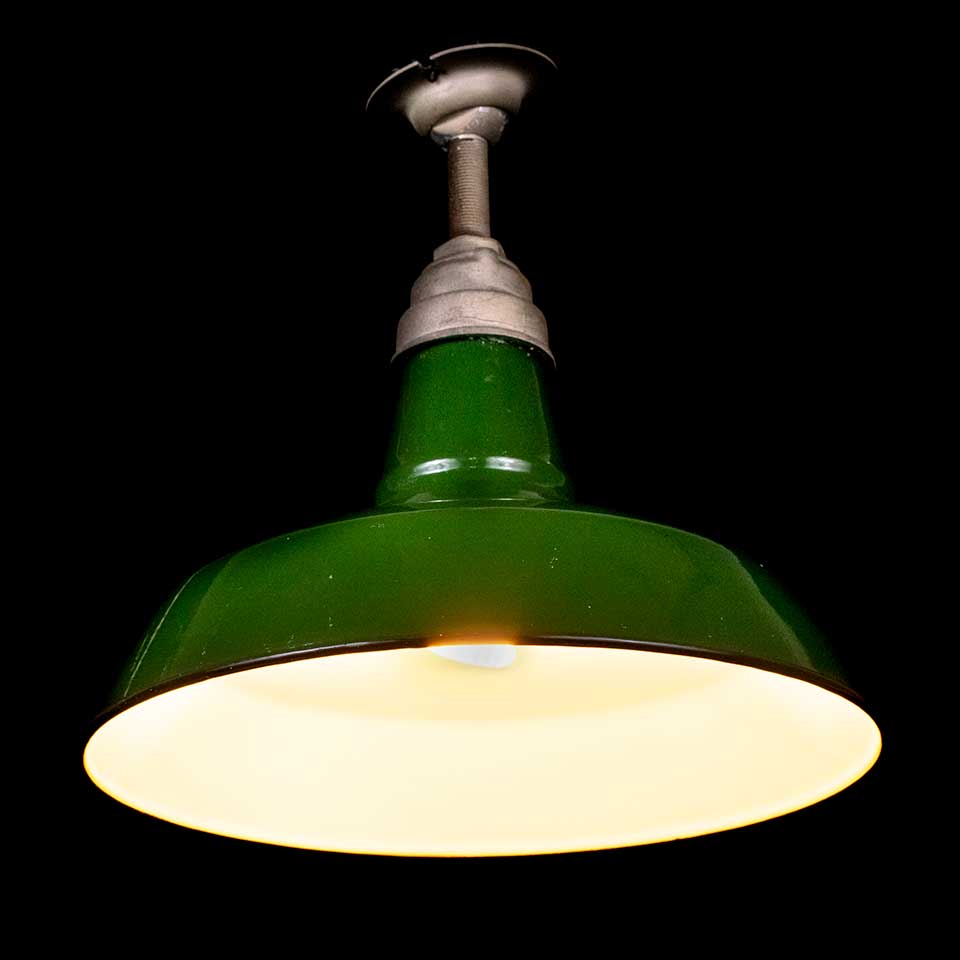 Vintage antique architectural salvage green porcelain enameled industrial farmhouse pendant light fixture measuring approximately 14" diameter. Priced at $148/each. Due to the nature of architectural salvage - condition and fittings may vary.