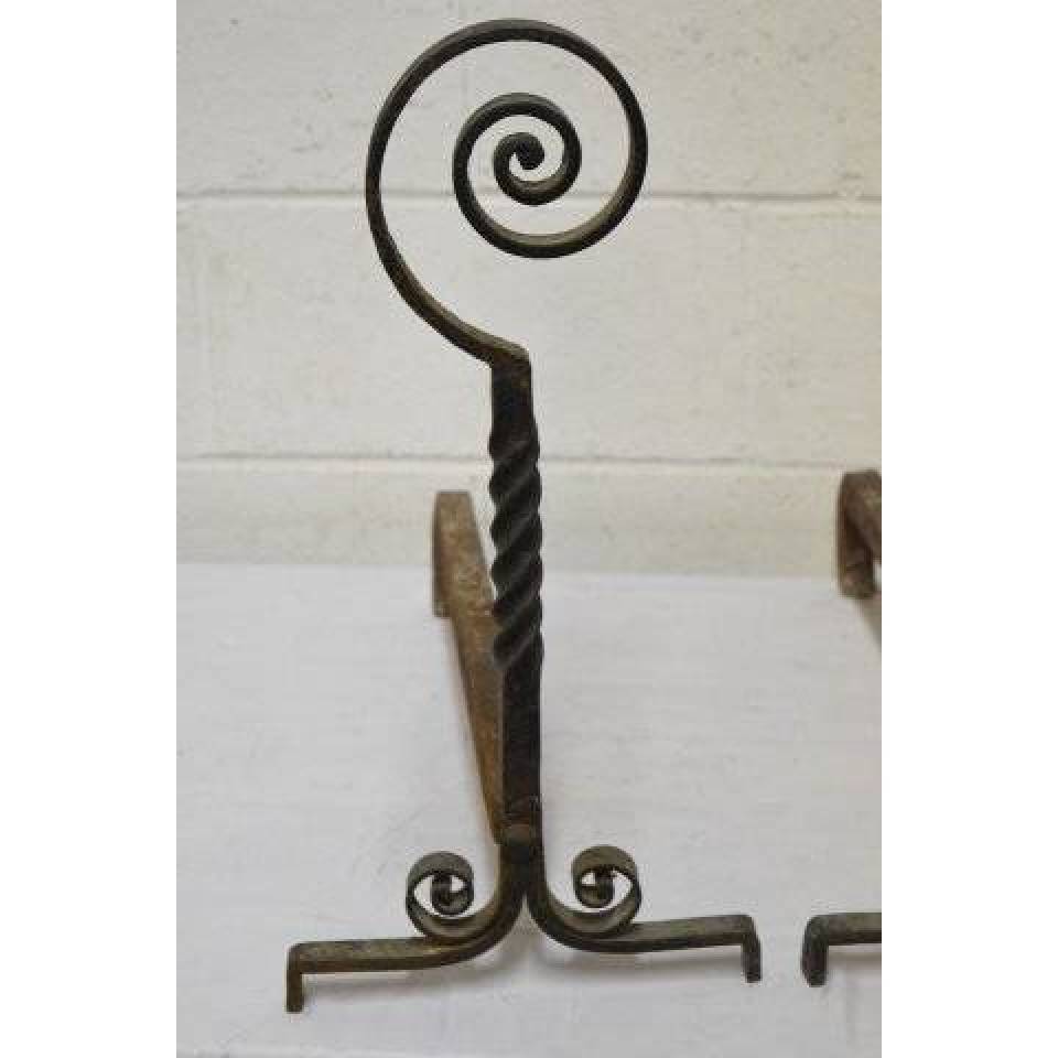 Great looking pair of antique architectural salvage wrought iron fireplace andirons each measuring approx. 9 1/2" wide x 19 1/2" tall x 19 1/2" front to back. Priced at $175 for the pair.