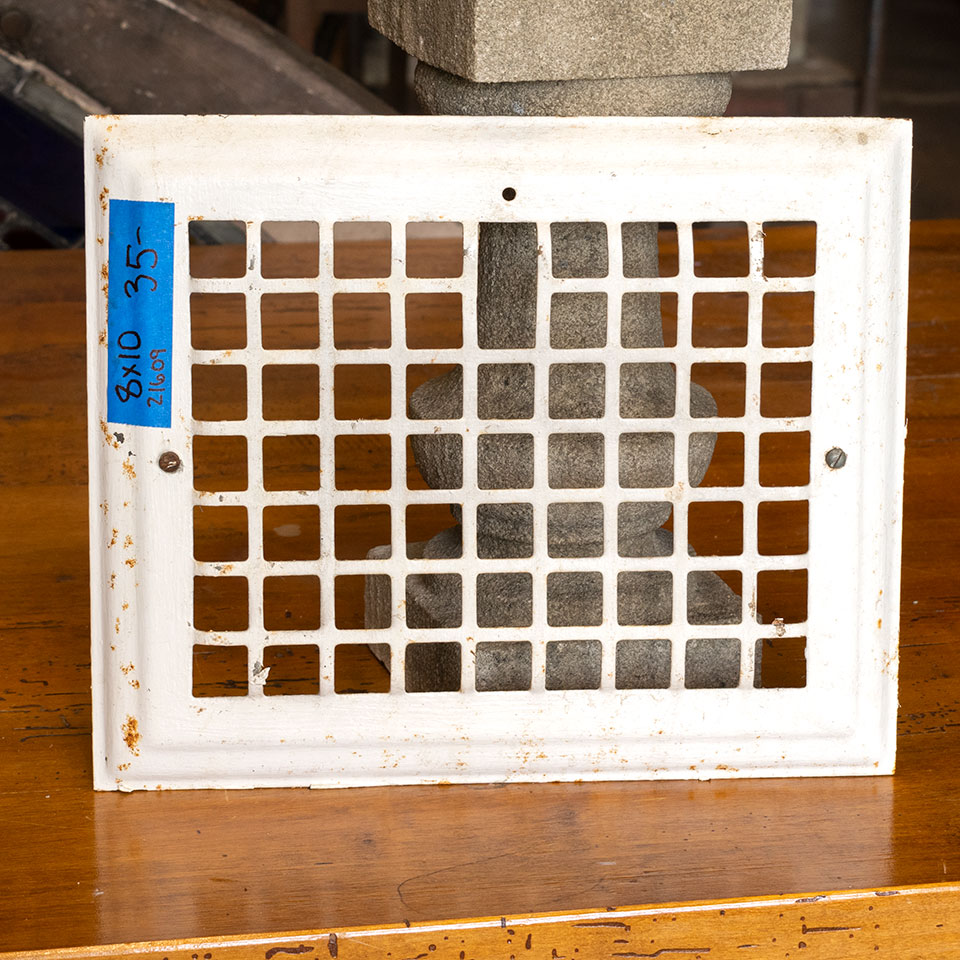 Vintage antique architectural salvage stamped metal wall heat grate measuring approximately 8" x 10" (insert dimensions) and 9 3/4" x 11 3/4" (overall dimensions). This grate does not have louvers.