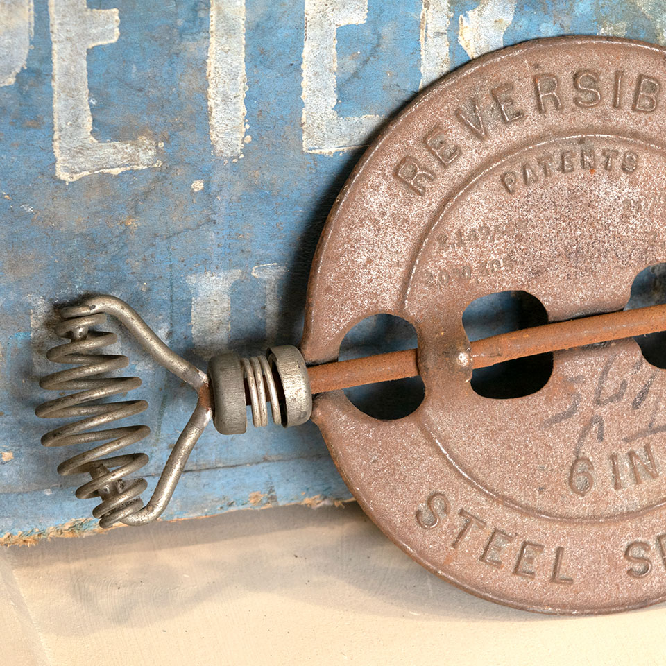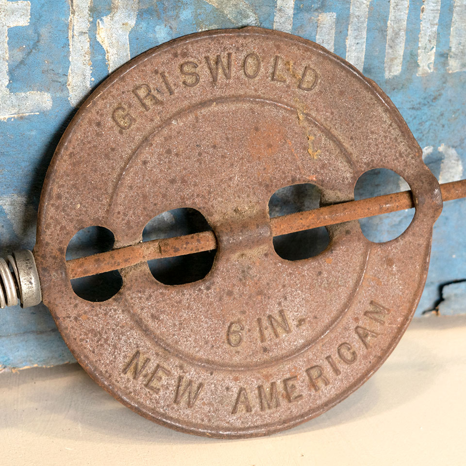 Vintage antique architectural salvage Griswold New American 6" inch reversible steel spindle stove pipe flue damper measuring approximately 6" x 9 1/2" overall.