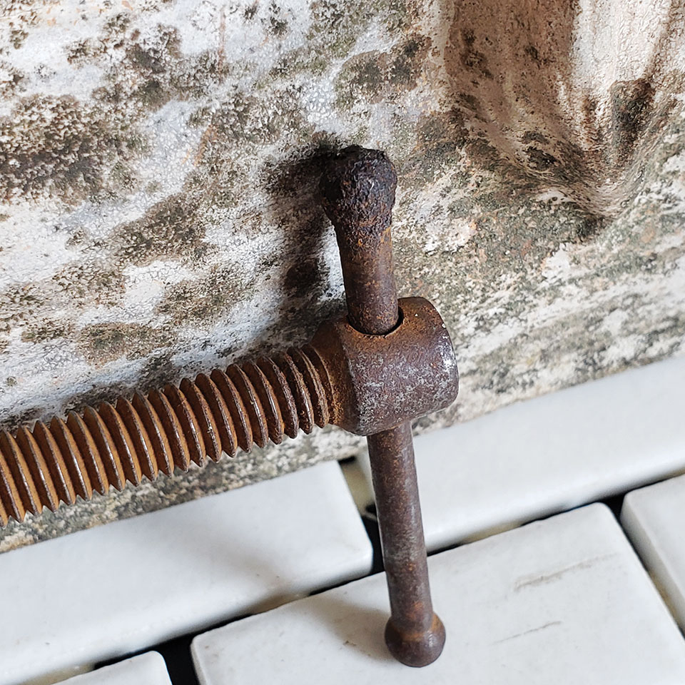 Vintage malleable iron c-clamp measuring 3 3/8" x 2" overall with a 1 7/8" maximum opening.