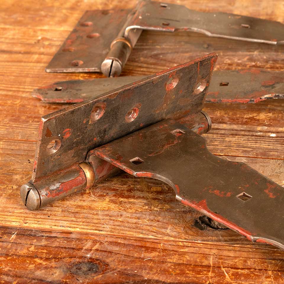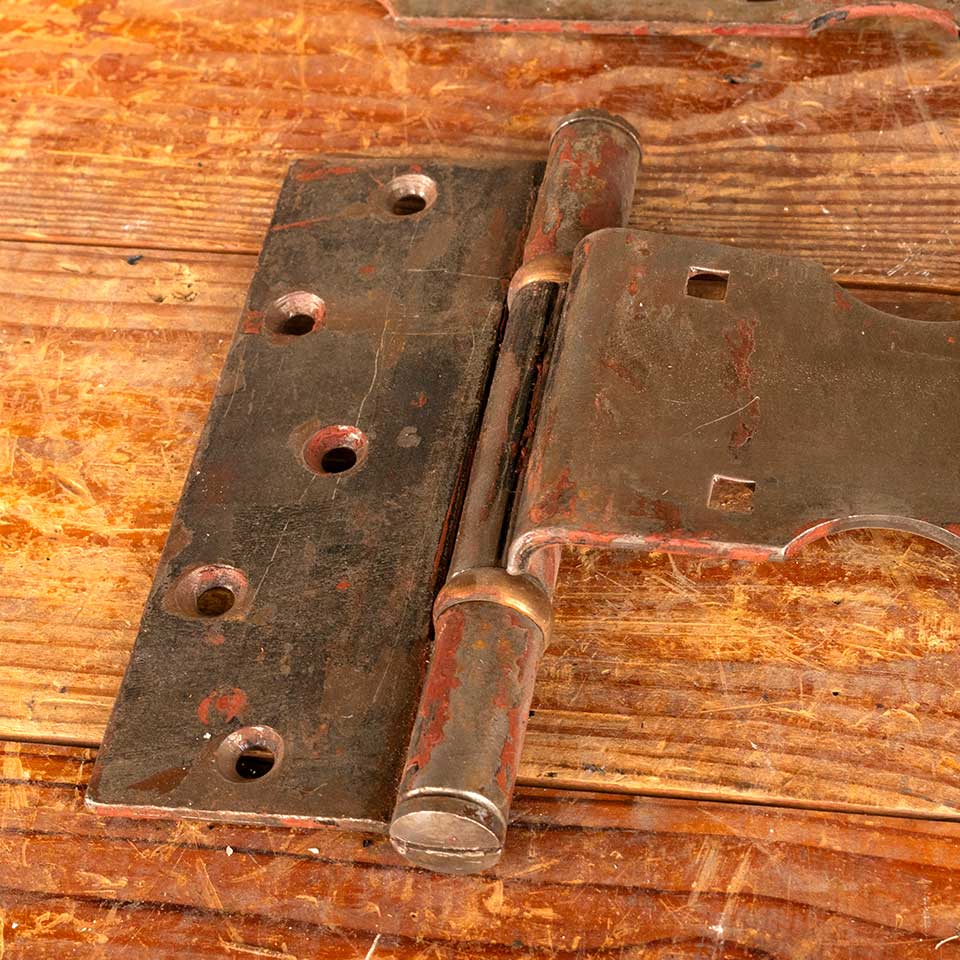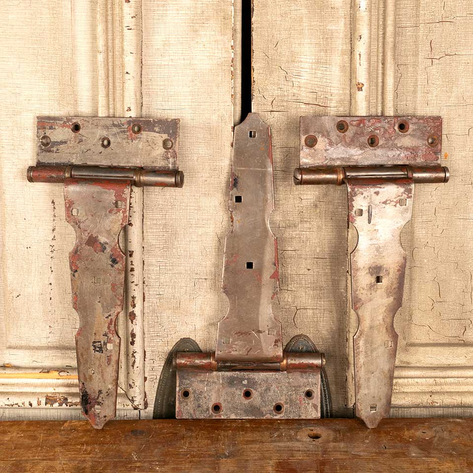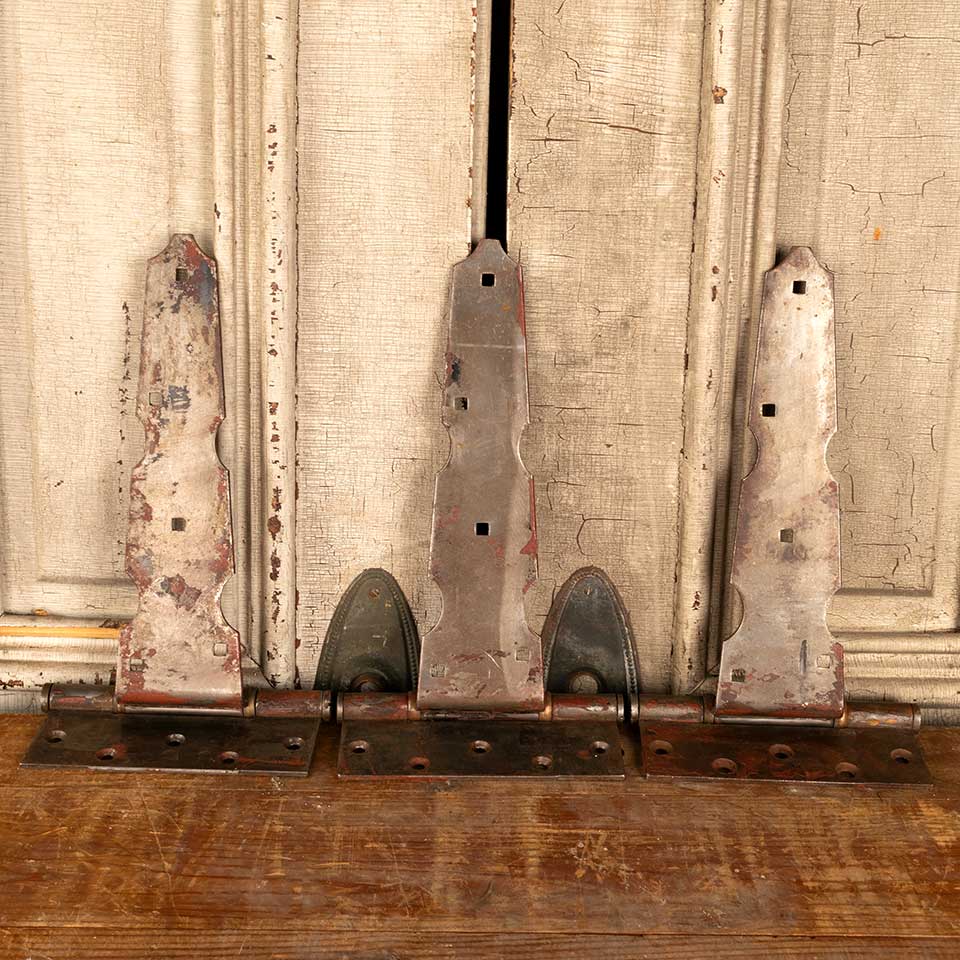 Set of three architectural salvage vintage heavy duty ball bearing iron strap door hinges each measuring approx. 15" long x 7 3/8" tall x 1 1/2" front to back. See photos to evaluate condition. Priced at $225 for the set.