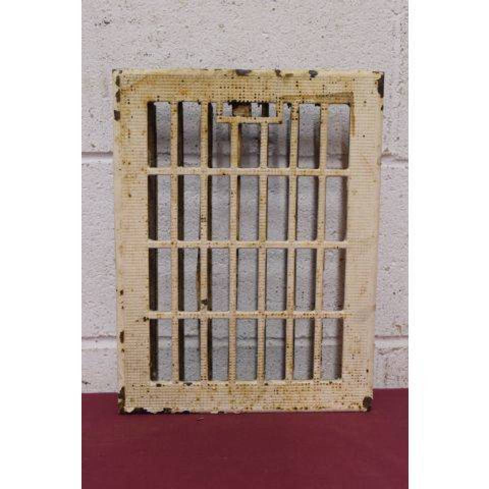 Vintage/antique architectural salvage cast iron heat grate with operable louvers measuring approximately 9" x 12" (insert dimensions) and 10 1/2" x 14" (overall dimensions).