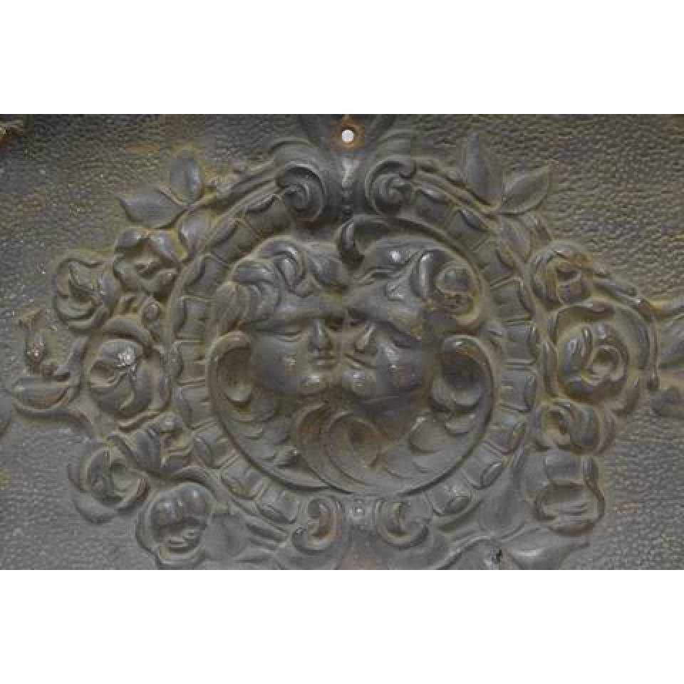 Vintage/antique architectural salvage ornate cast iron fireplace front with figural motif measuring approximately 23 3/4" wide x 13" tall x 3 1/2" front to back.