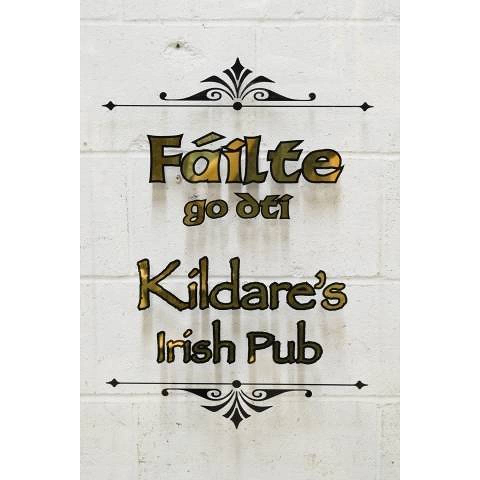 Architectural salvage glass window pane from Kildare's Irish Pub with gold lettering measuring approximately 26 3/4" wide x 47 3/4" tall. Lettering translates to "Welcome to Kildare's Irish Pub".