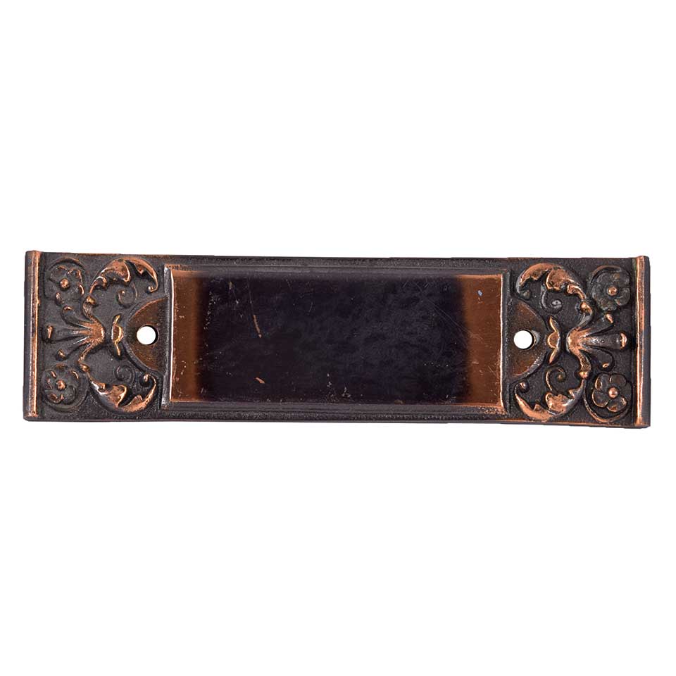 Vintage/antique new old stock architectural salvage cast metal engravable name plate marked CORBIN measuring approximately 4 1/8" wide x 1 1/8" tall x 3/16" thick. Several finishes available (See photos). Mounting holes measure 2 1/2" on center. Priced at $18/each.