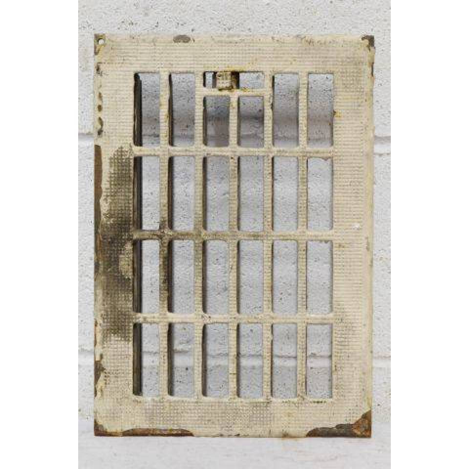 Vintage/antique architectural salvage cast iron heat grate with operable louvers measuring approximately 8" x 12" (insert dimensions) and 9 1/2" x 13 3/4" (outside dimensions).