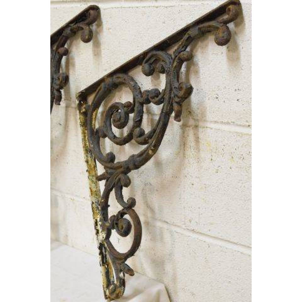 Pair of vintage/antique architectural salvage ornate cast iron brackets each measuring approximately 1" wide x 16" tall with a 16" projection. Priced at $225 for the pair.
