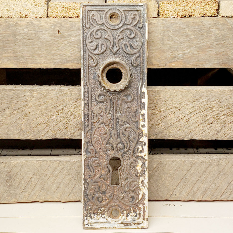 Antique architectural salvage cast iron Russell & Erwin Avallon pattern doorknob backplate c.1899 (approx. 1 5/8" wide x 5 5/8" tall with a 3/4" diameter collar). The spindle and keyhole measure 2 1/2" on center. Color and condition vary, see photos to evaluate. Priced at $28/ each.