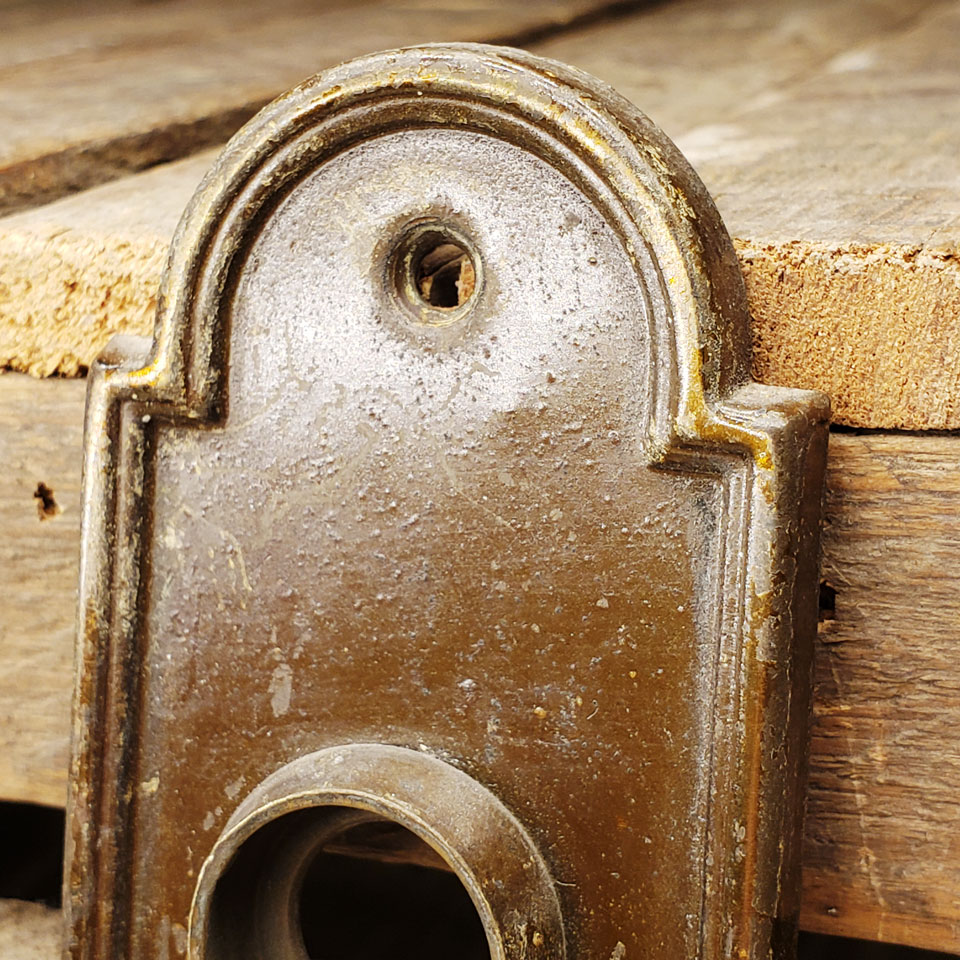 Antique architectural salvage interior doorknob backplate measuring approximately 1 7/8" wide x 6" tall x 3/8" front to back. Sold individually. Priced at $15/each. Condition may vary.