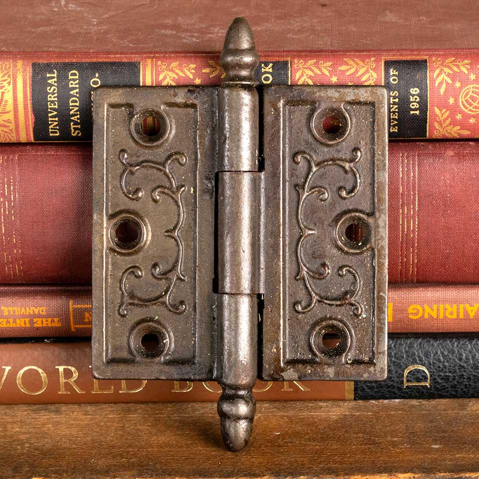 Architectural salvage antique ornate cast iron acorn finial door hinge hardware measuring approx. 3 1/2" squared (5" tall including finials). Color and condition vary, see photos to evaluate. Priced at $35/each.