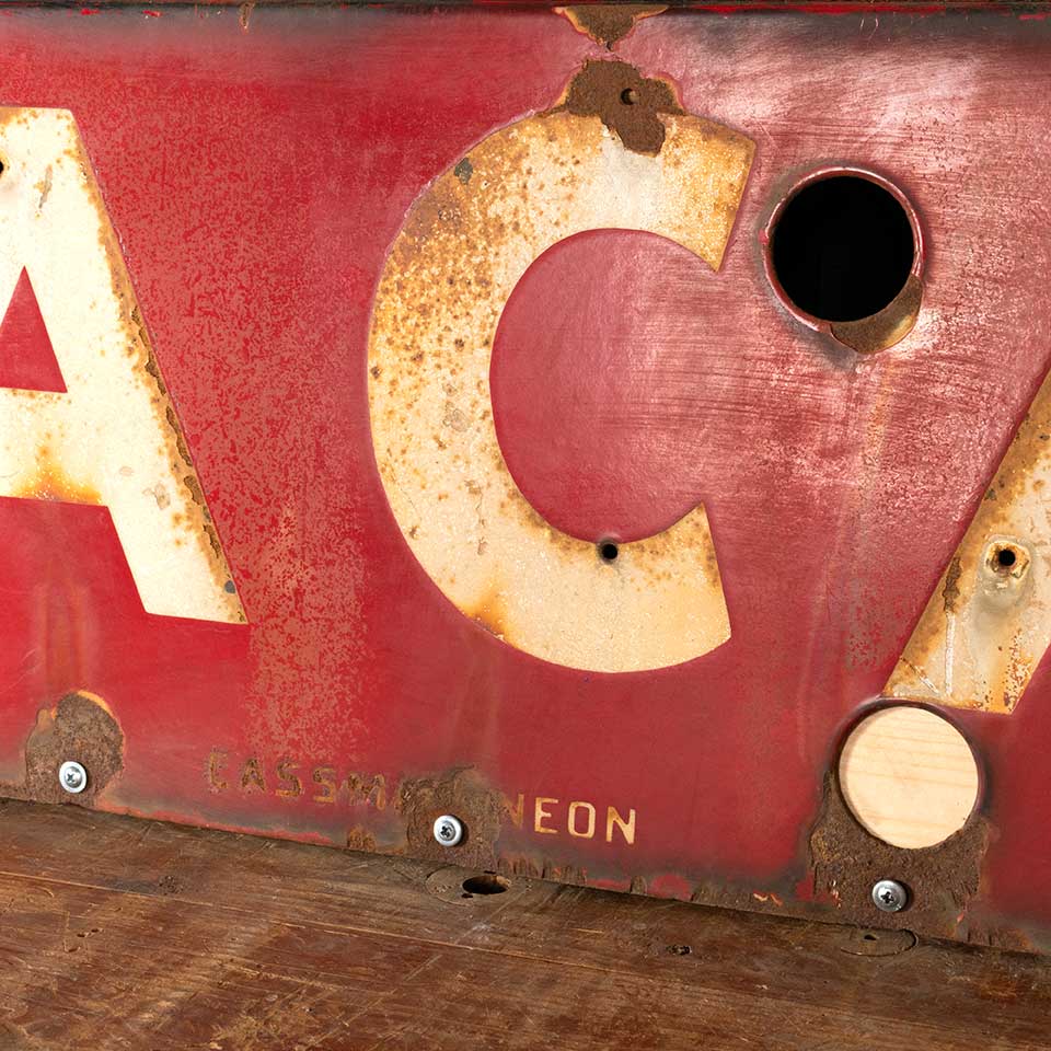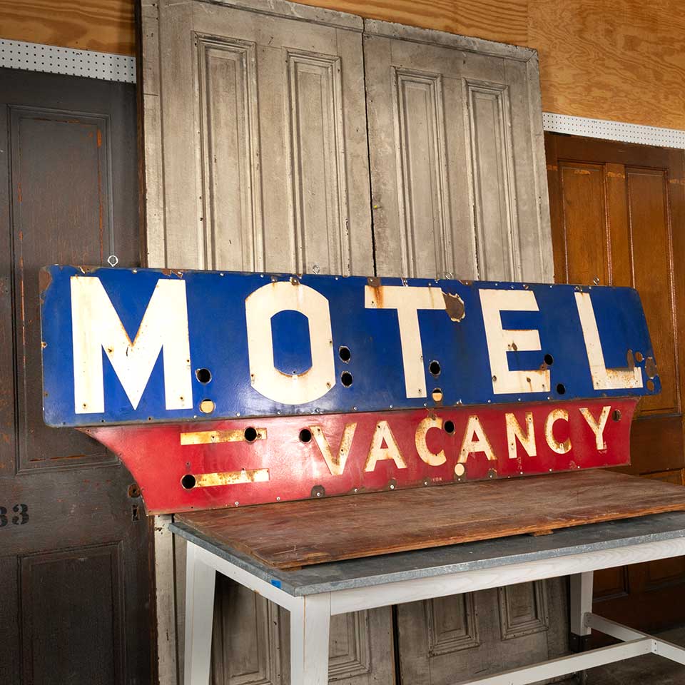 Architectural salvage antique two-piece porcelain enameled metal MOTEL VACANCY sign measuring approx. 105 1/4" long x 31 3/8" tall x 1/8" thick (both together). There's no neon with this sign and there's some surface material loss. See photos to evaluate condition.