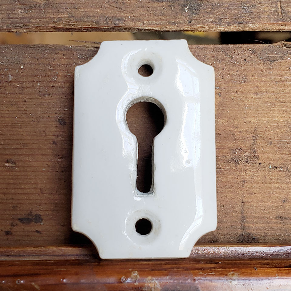 Antique architectural salvage white porcelain skeleton keyhole escutcheon cover plate door hardware with inverted corners measuring approximately 1 1/8" wide x 1 11/16" tall and screw holes measure 1 1/4" on center. Sold individually. Priced at $20/each. Due to the nature of antique salvage - condition may vary.