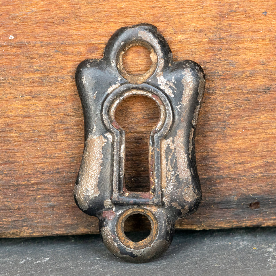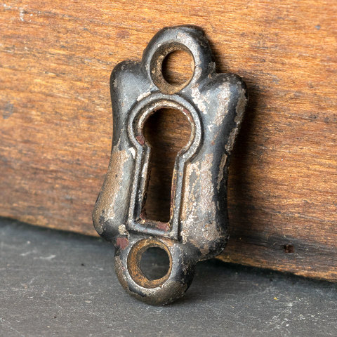 Antique architectural salvage cast iron skeleton keyhole escutcheon cover plate door hardware measuring approximately 7/8" wide x 1 5/8" tall. Sold individually. Priced at $10/each. Condition may vary.