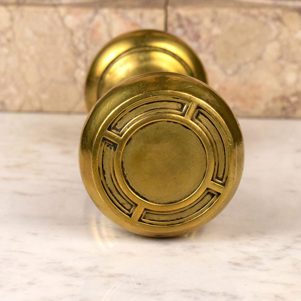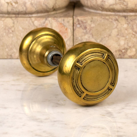 Antique architectural salvage doorknob set with patterned brass knob, brass plated steel knob, threaded spindle, and set screws. The patterned brass knob measures 2 1/8" in diameter with a 5/8" diameter neck and the plated knob measures 2" in diameter with a 5/8" diameter neck.