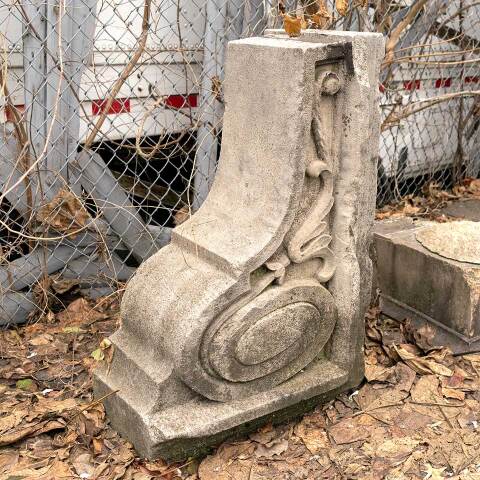 Architectural salvage antique carved stone building bracket/corbel ornament measuring approx. 12 3/4" wide x 30 3/4" tall x 21 1/2" front to back. This would be a fantastic piece to use as a garden element. See photos to evaluate condition.