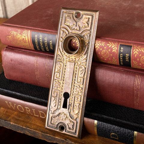 Architectural salvage antique pressed steel Corbin Canton pattern pattern (c.1895) doorknob backplate door hardware measuring approx. 1 7/8" wide x 5 1/2" tall with a 7/8" diameter collar. The spindle and keyholes measure 2 1/2" on centers. Color and condition may vary, see photos to evaluate. Priced at $18/each.