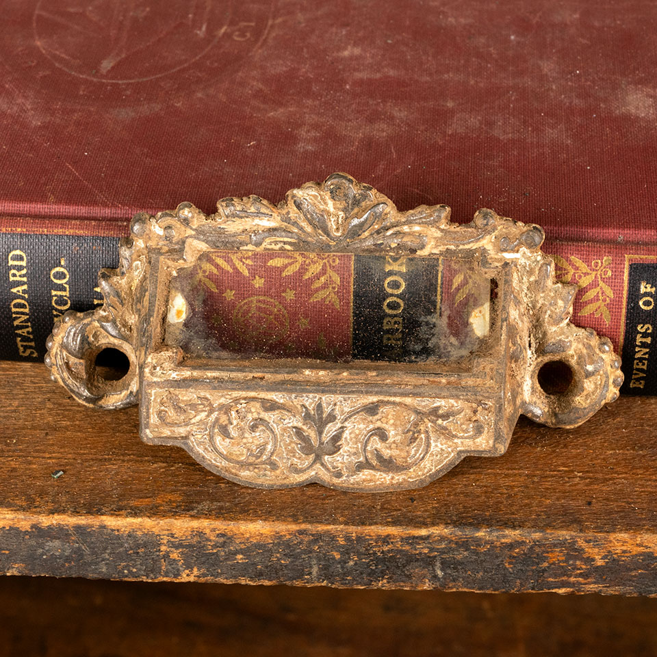Antique architectural salvage cast iron bin drawer pull card catalog apothecary hardware measuring approx. 3 1/2" wide x 1 7/8" tall x 3/4" front to back. Screw holes measure 3" on center. Some with glass, some without. Color and condition vary, see photos to evaluate. Priced at $25/each.