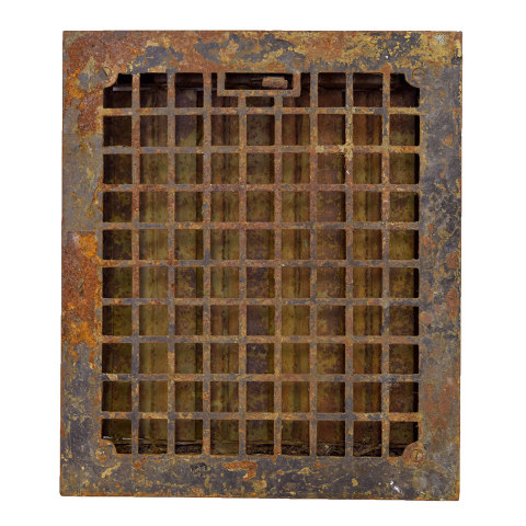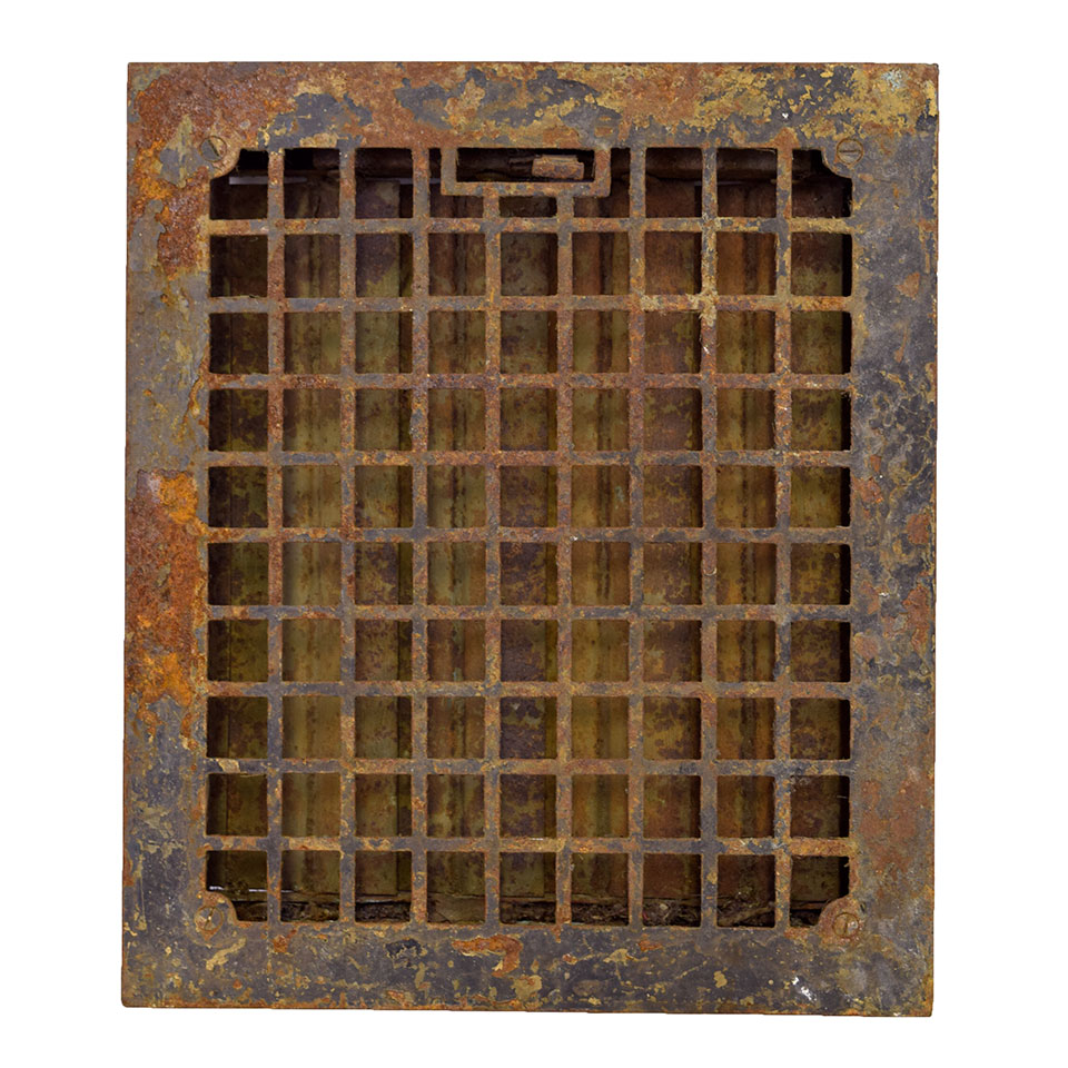 Vintage/antique architectural salvage cast iron heat grate with operable louvers measuring approximately 10" x 12" (insert dimensions) and 11 7/8" x 13 7/8" (overall dimensions).
