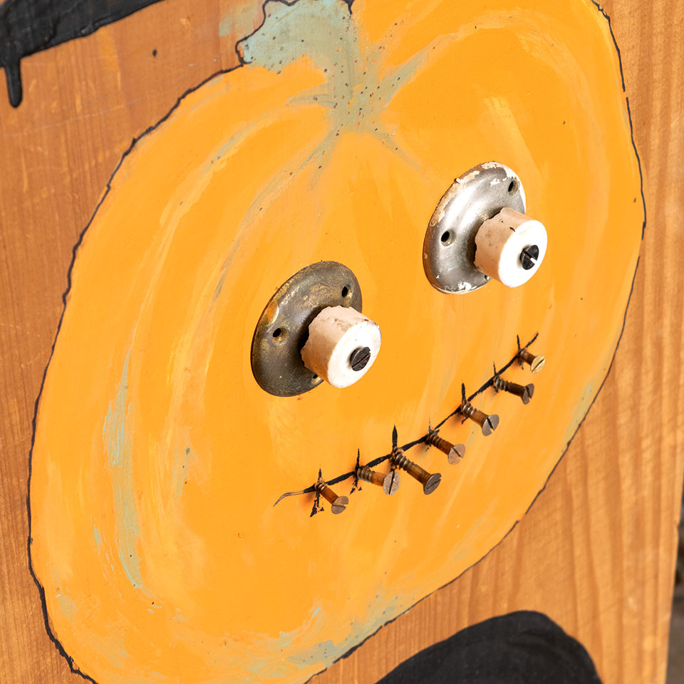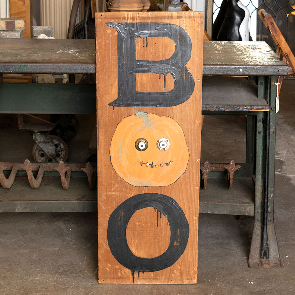 Reclaimed wood hand painted Halloween holiday BOO sign with salvaged hardware pumpkin face measuring approximately 16" wide x 41 1/2" tall.