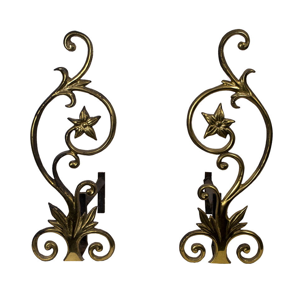Pair of vintage brass fireplace andirons with floral motif each measuring approx. 6 7/8" wide x 18 5/8" tall x 19 1/4" front to back. See photos to evaluate condition. Priced at $75 for the pair.