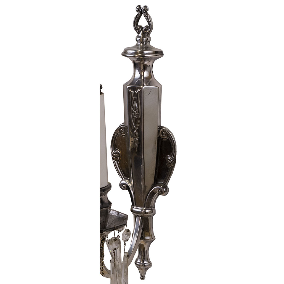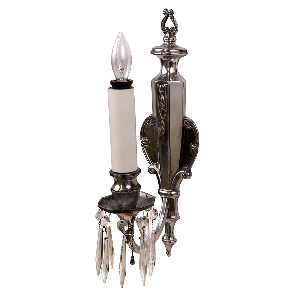 Vintage/antique architectural salvage CB Rogers Adam style Neoclassical silver plate pewter wall sconce with prisms measuring approximately 3 5/8" wide x 13 1/2" tall with a 6" projection. Priced at $225/each. Due to the nature of architectural salvage - condition and color may vary.