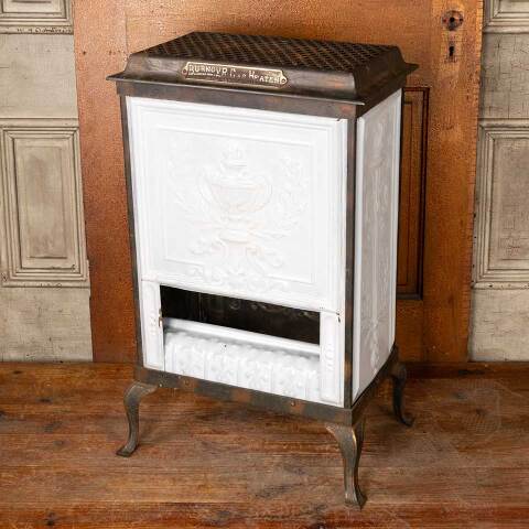 Architectural salvage antique cast iron Burnovr Gas Heater with porcelain enameled panels and lift off top measuring approx. 22 3/4" wide x 35 1/2" tall x 15 3/8" front to back. There are no internal parts. See photos to evaluate condition.