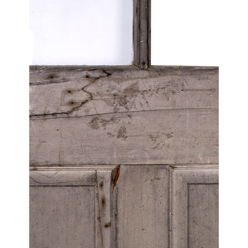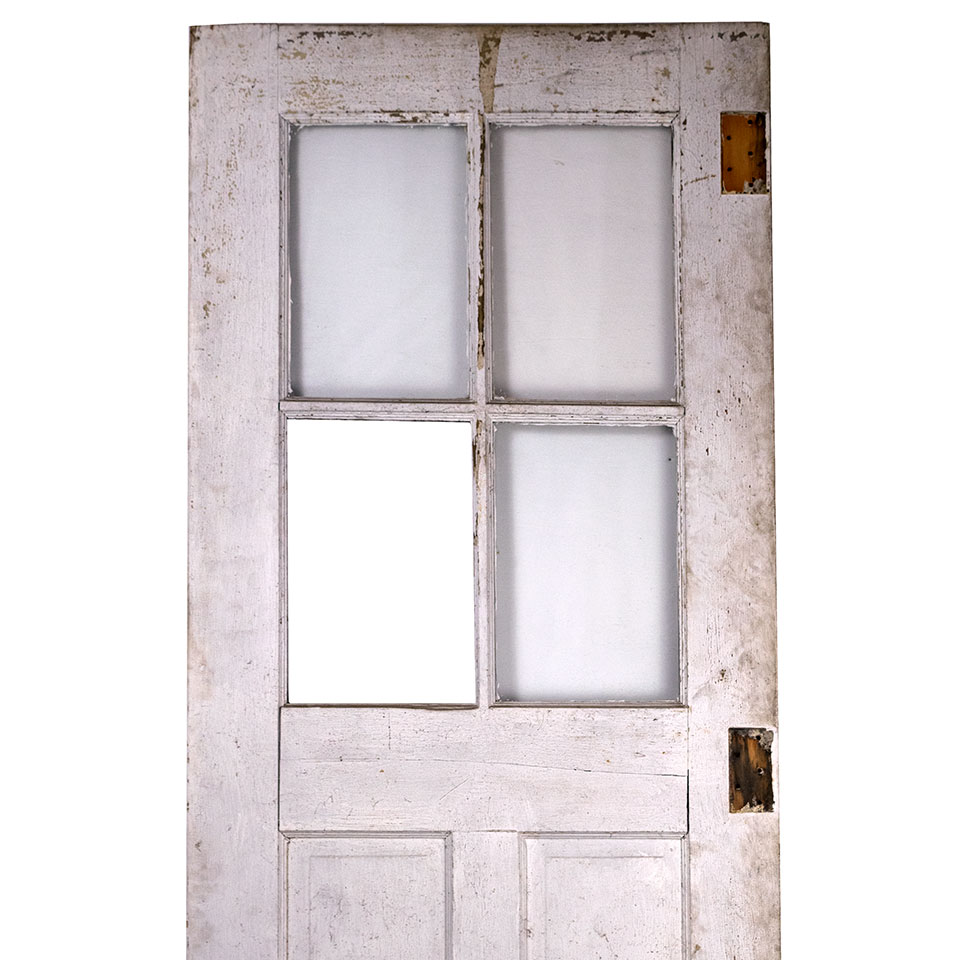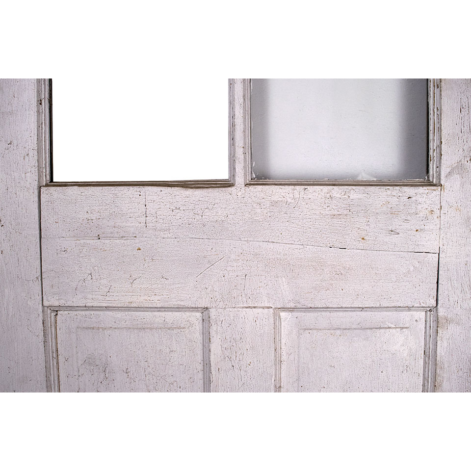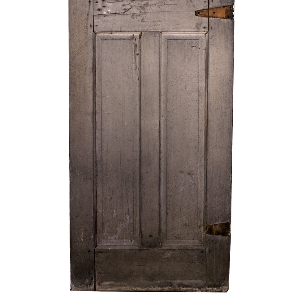 Vintage antique architectural salvage wood paneled carriage door with divided lite window measuring approximately 32" wide x 96 3/8" tall x 1 3/4" thick. This door is missing one pane (See photos).