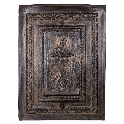 Architectural salvage antique cast iron fireplace summer front cover with figural motif measuring approx. 20 1/4" wide x 26 3/4" tall x 2" front to back. See photos to evaluate condition.