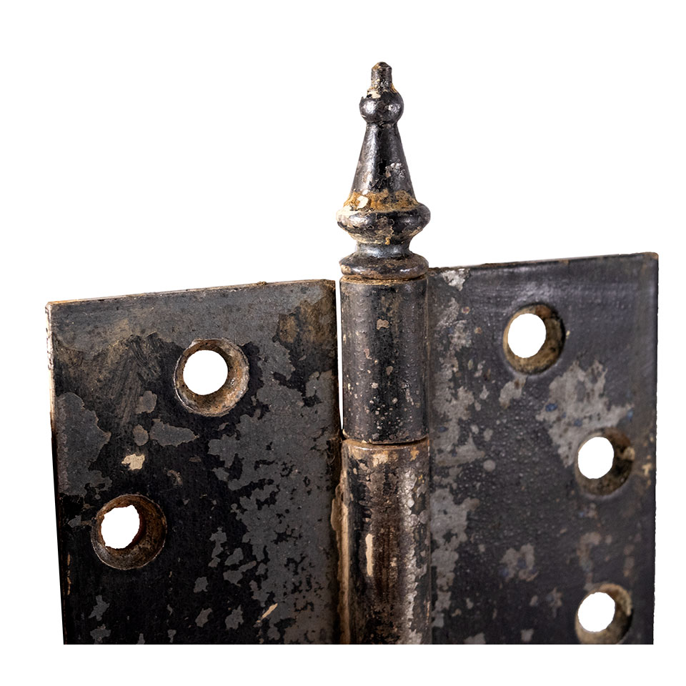 Vintage antique architectural salvage cast iron steeple door hinge hardware measuring approximately 4" square x 6 3/8" tall (including steeple finials). Priced at $35/each. Due to the nature of salvaged hardware - condition, color, and patina may vary.