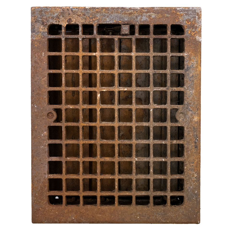 Vintage antique architectural salvage cast iron heat grate with operable louvers measuring approximately 9" x 12" (insert dimensions) and 10 7/8" x 13 7/8" (overall dimensions).