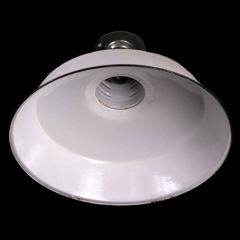 Vintage antique architectural salvage farmhouse industrial porcelain enameled ceiling light fixture with vented neck measuring approximately 16 1/8" in diameter with a 9 1/2" drop. Priced at $165/each. Due to the nature of architectural salvage - condition and color may vary.