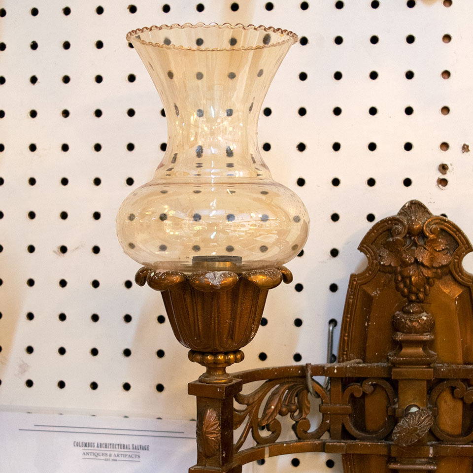 Vintage antique architectural salvage cast bronze 2 arm wall sconce with glass shades measuring approximately 14 1/2" wide x 14 3/8" tall with a 6 3/8" projection. Matching crossbar finial included. Priced at $275/each. Due to the nature of architectural salvage - condition, color, and patina may vary.