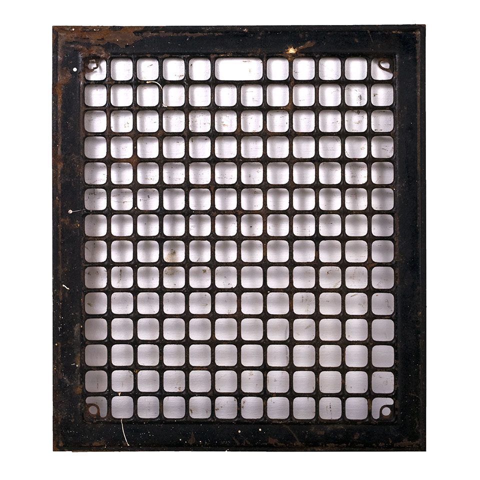 Vintage antique architectural salvage pressed metal heat grate measuring approximately 12" x 14" (insert dimensions) and 14 1/16" x 16 1/8" (overall dimensions). This grate does not have louvers and has some damage to louver mounts (See photos).