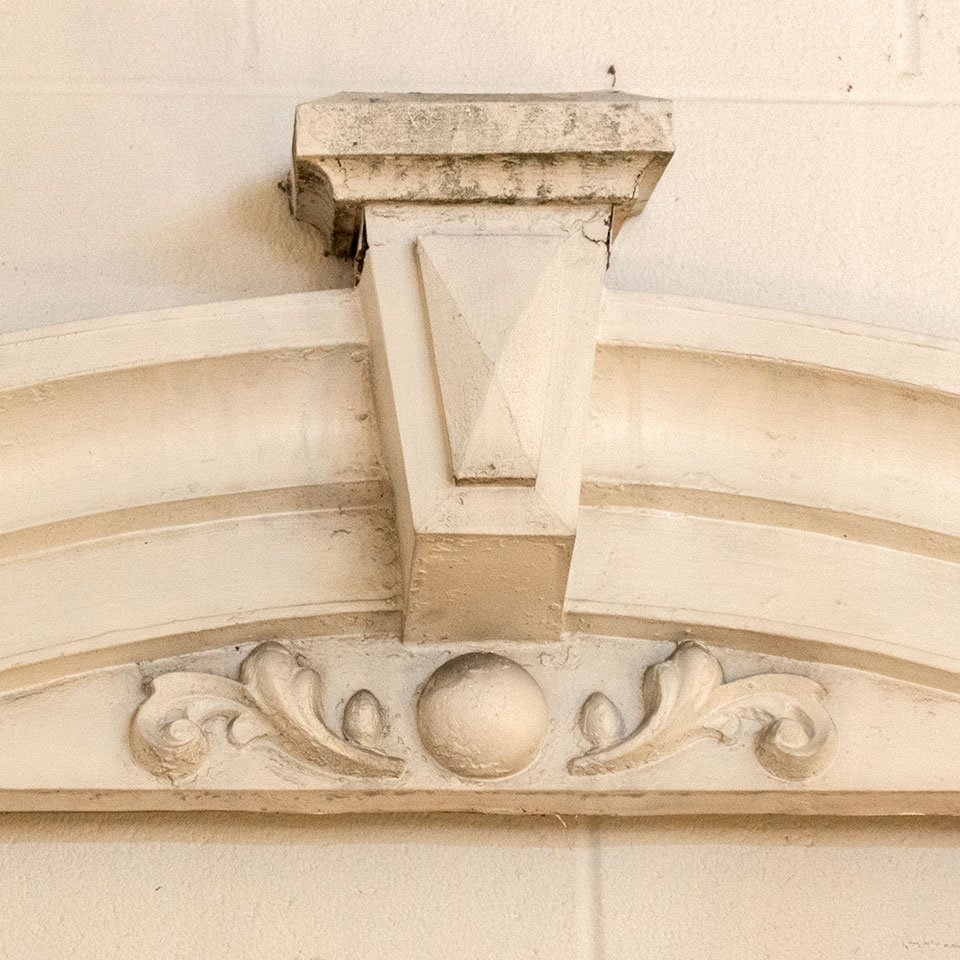 Vintage antique architectural salvage hollow zinc metal window pediment with keystone measuring approximately 47 1/2" wide x 37" tall with a 9" projection. Interior window opening measures approximately 34" wide x 21" tall. More available. Please CONTACT US for details.
